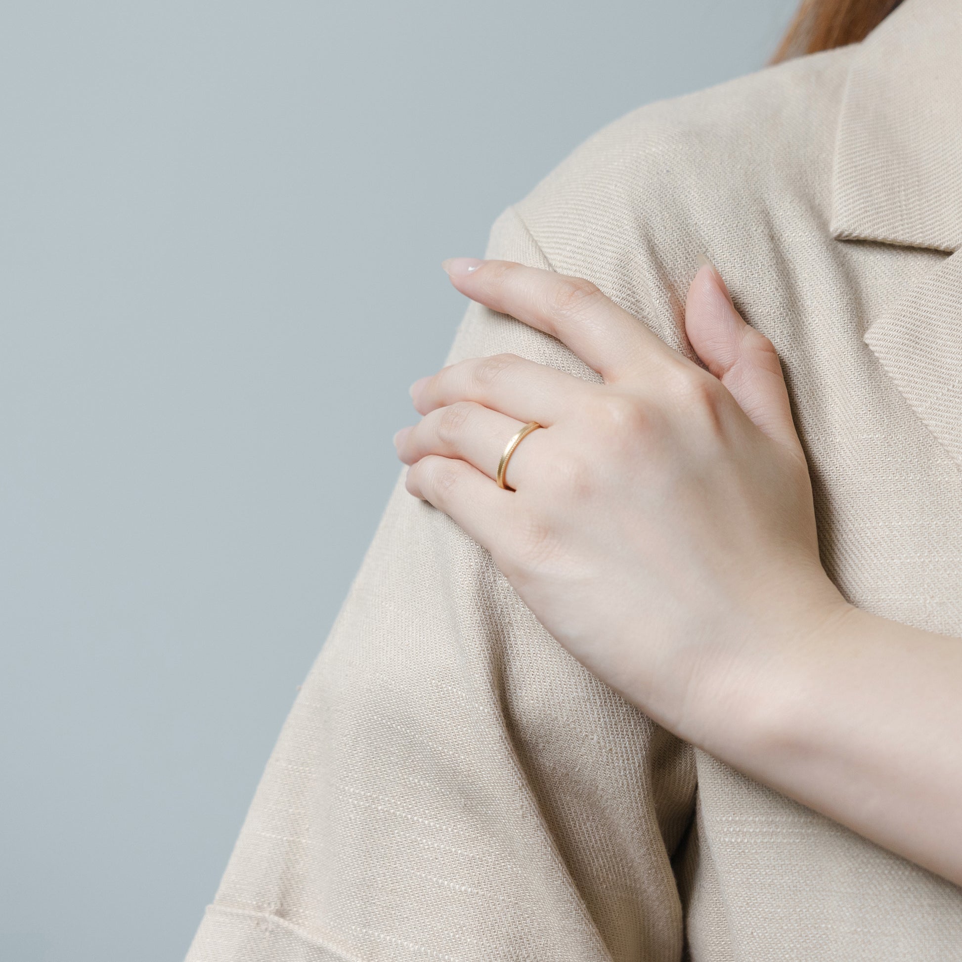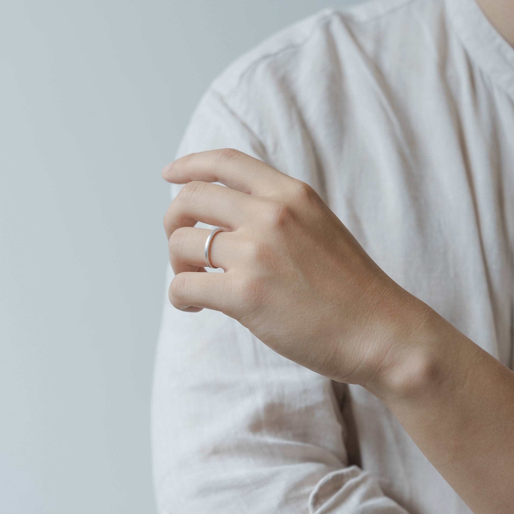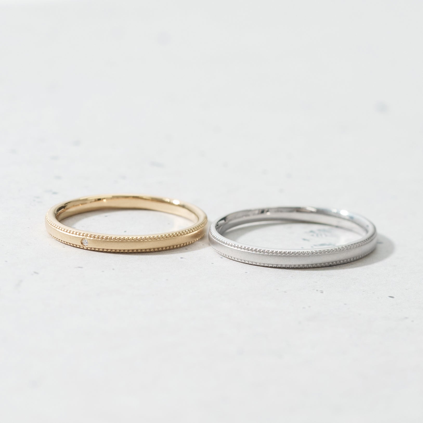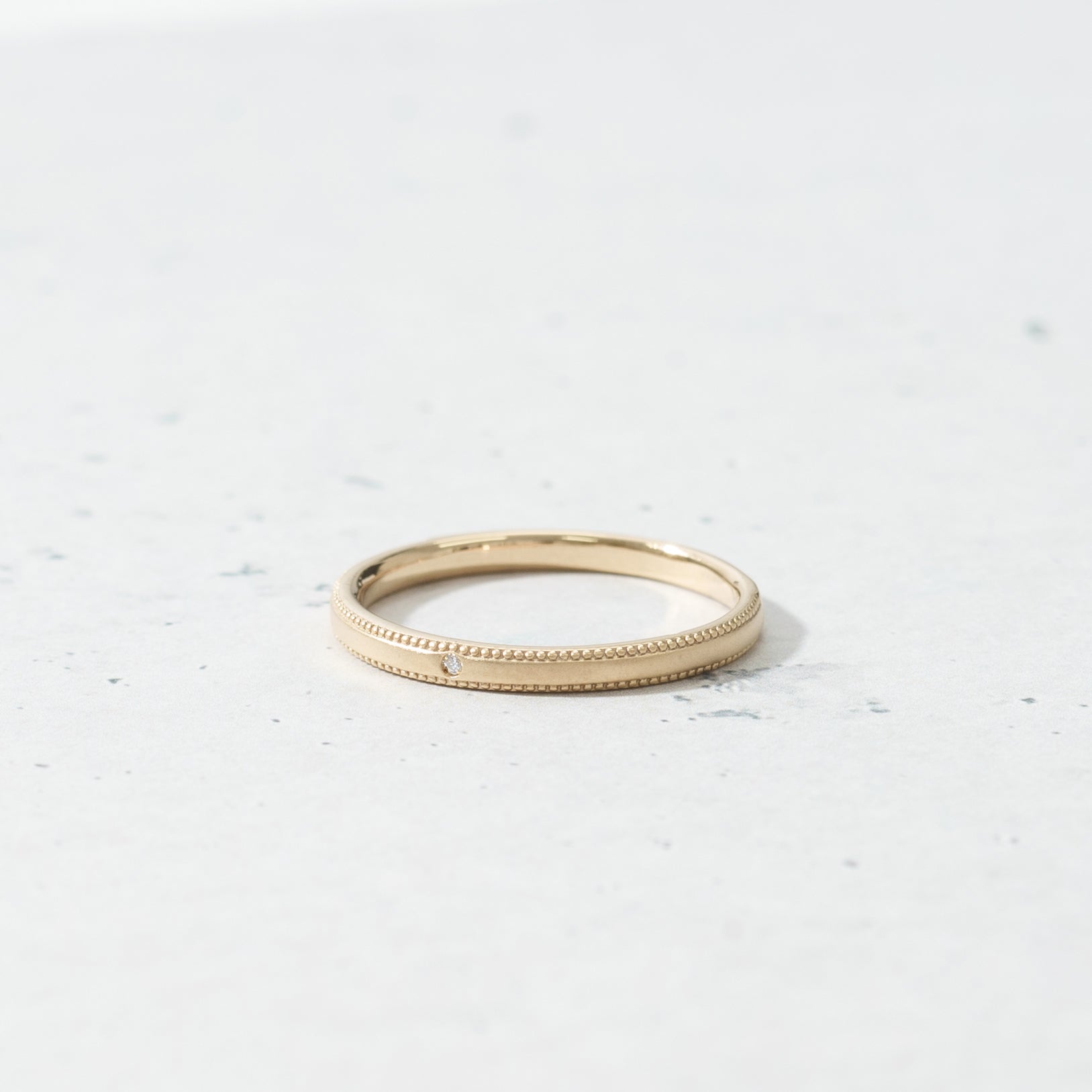 リングの淵にミルを施し、表面をつや消し加工することによりアンティーク調の温かみのあるデザインに。