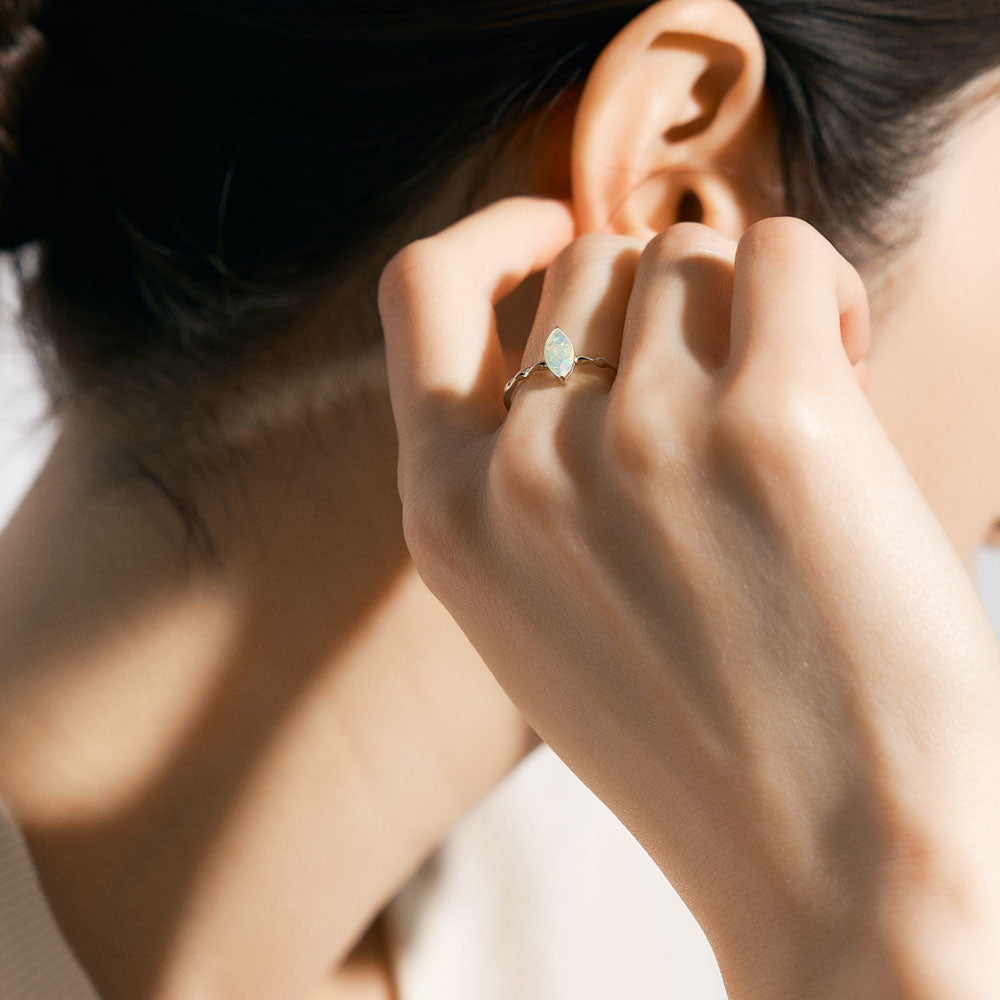 乳白色の中に虹色の光が浮かぶような幻想的な表情を見せるオパールは、角度によって色味が変化します。