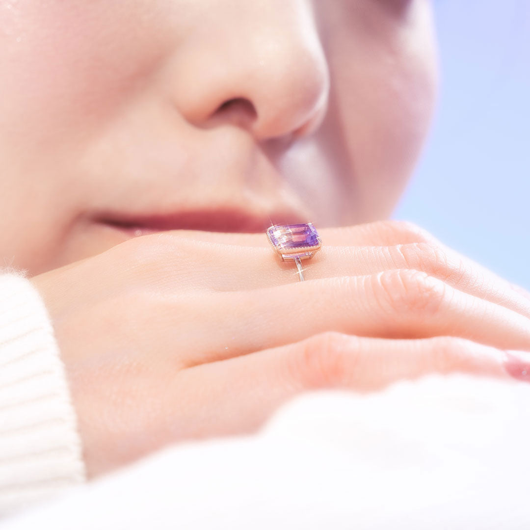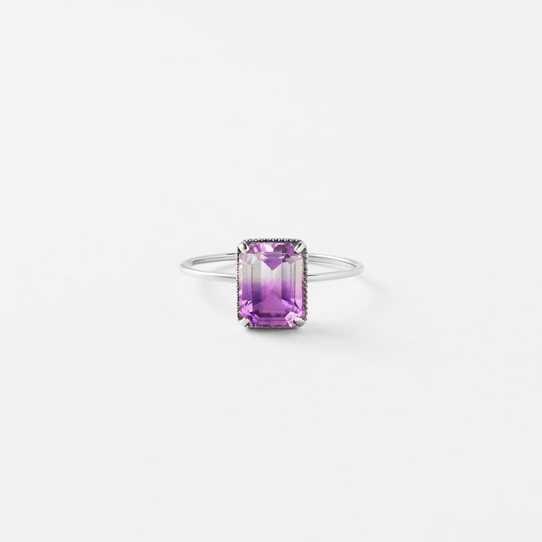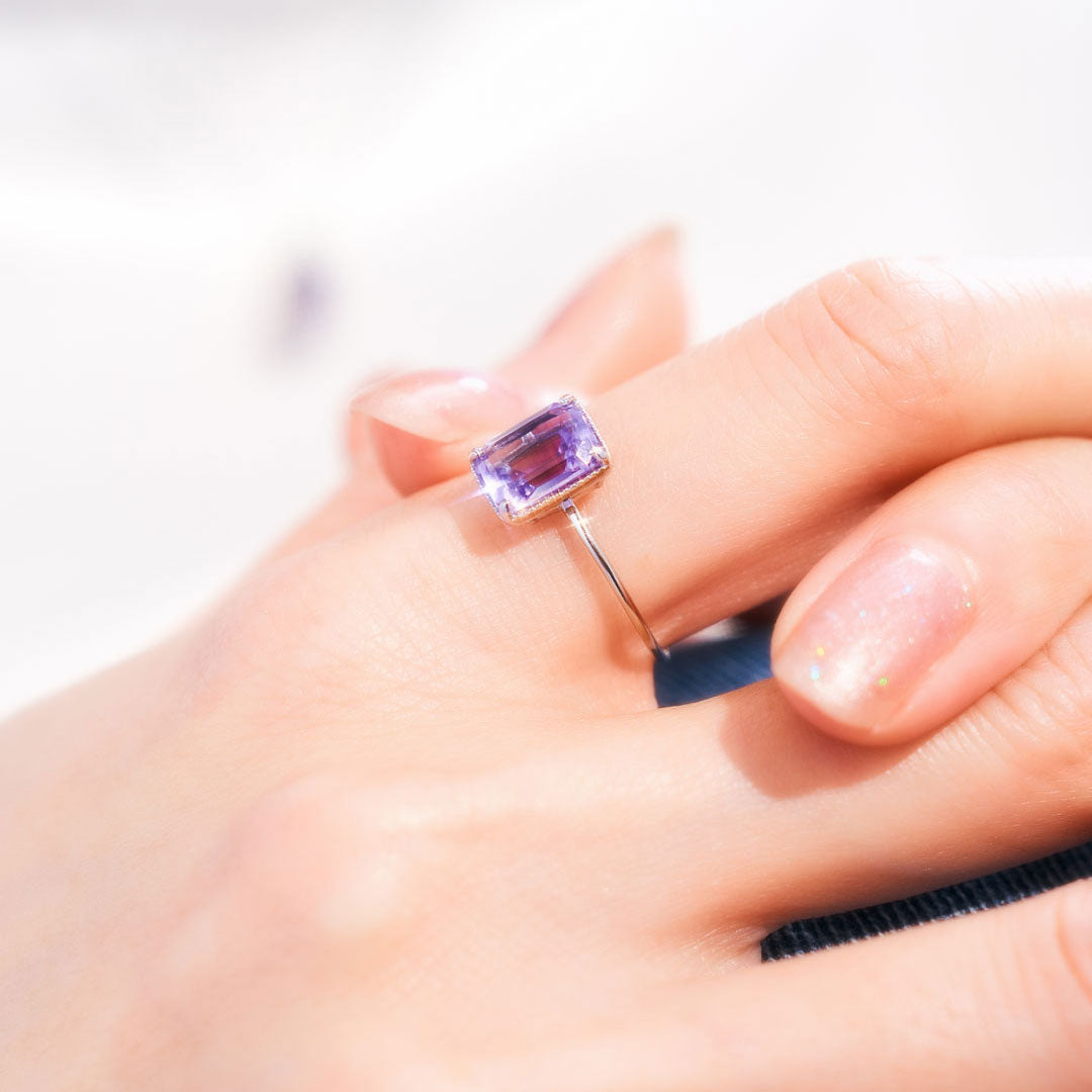 淡く溶け合う色彩が指先で静かに輝く、プラチナ素材とバイカラーアメジストのリングの透明感のある光が、上品な存在感を演出します。