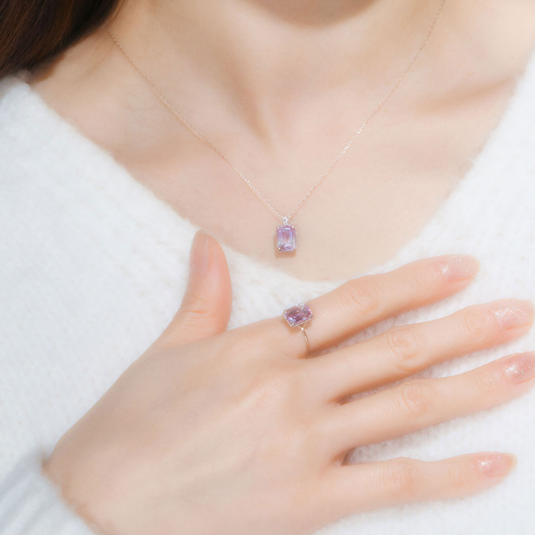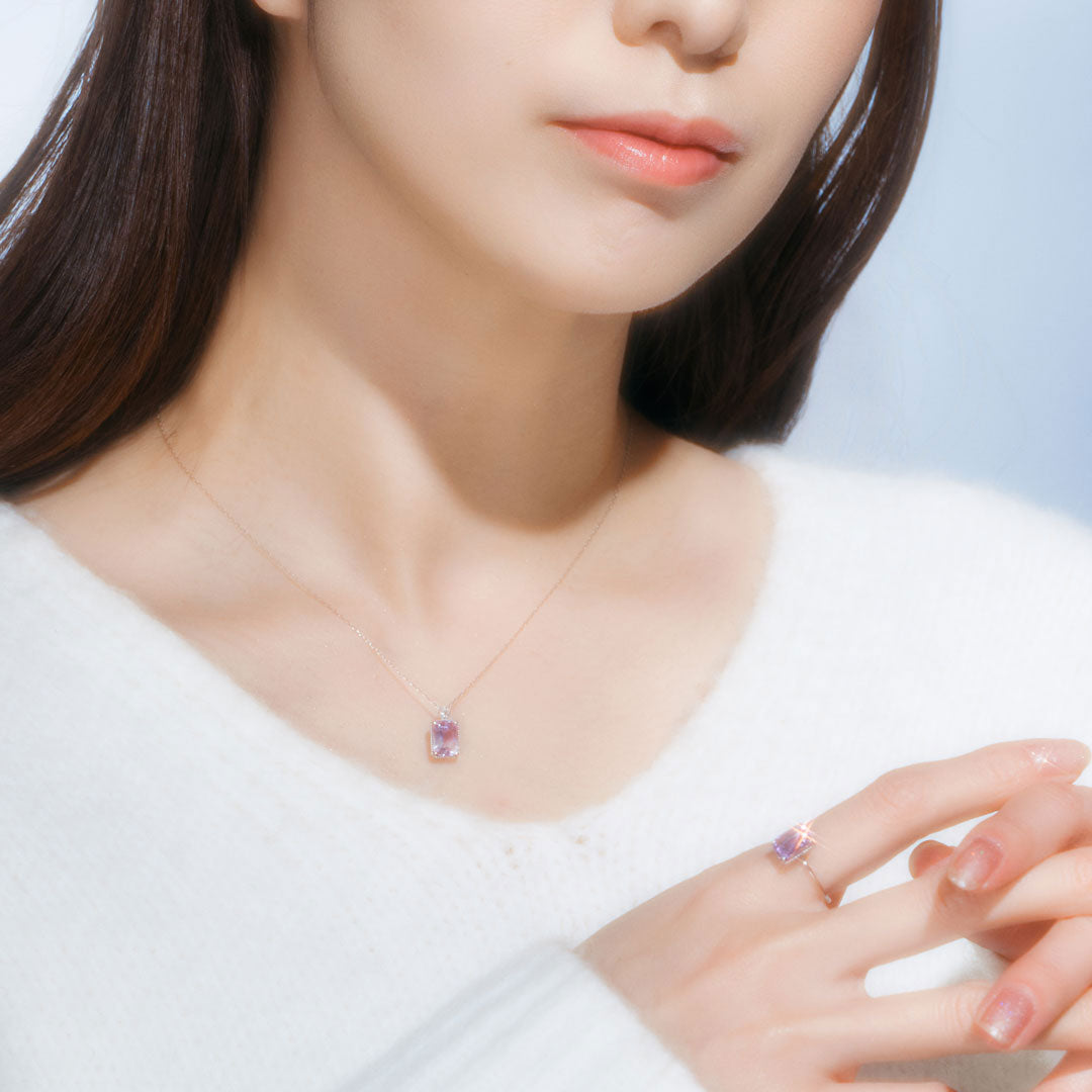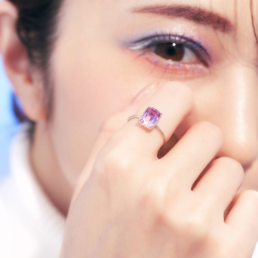 色の移ろいを美しく捉えるスクエアカットと、プラチナならではの端正な輝きが調和し、甘さを抑えた、凛とした印象に。
