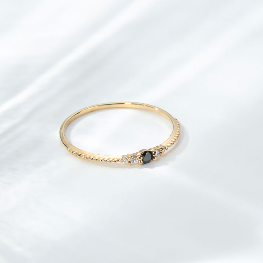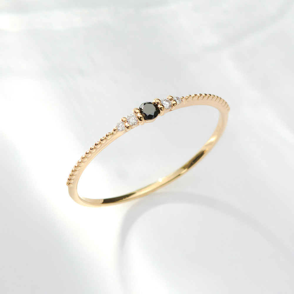リングには輝くブラックダイヤモンドがあしらわれており、繊細な色合いが指先を彩ります。