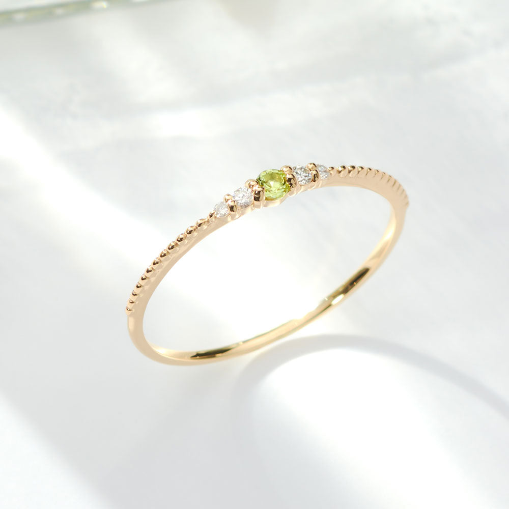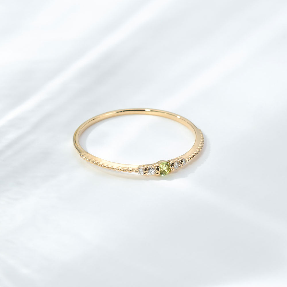 リングには輝くペリドットがあしらわれており、繊細な色合いが指先を彩ります。