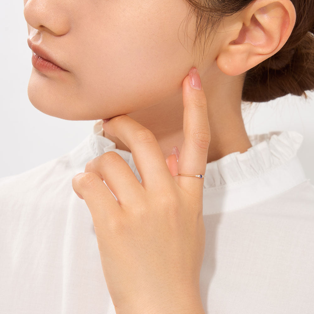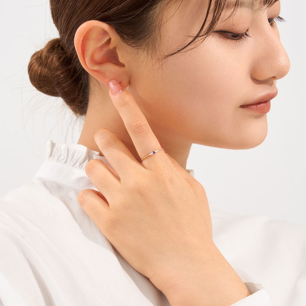 リングには輝くサファイアがあしらわれており、繊細な色合いが指先を彩ります。