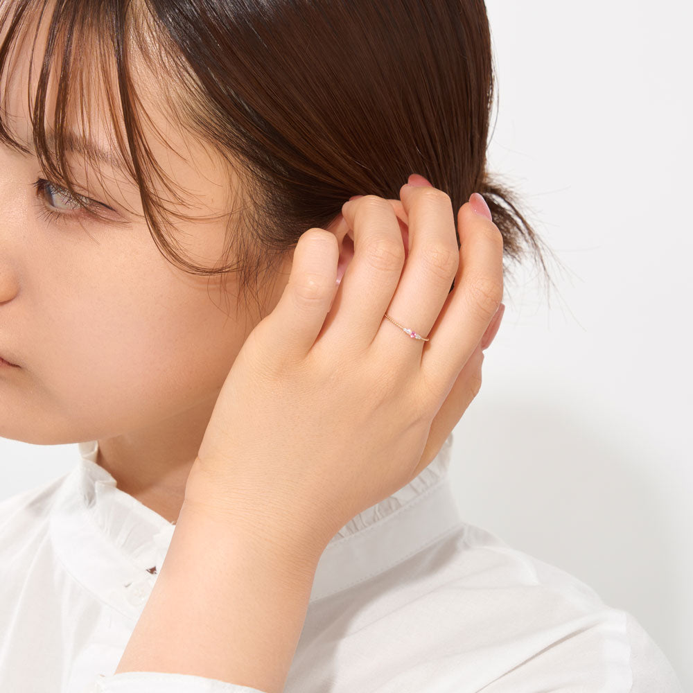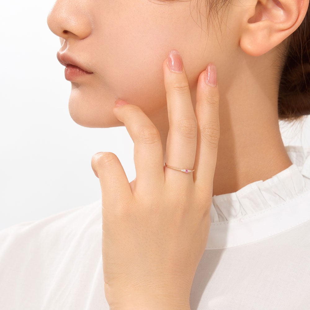 リングには輝くピンクトルマリンがあしらわれており、繊細な色合いが指先を彩ります。
