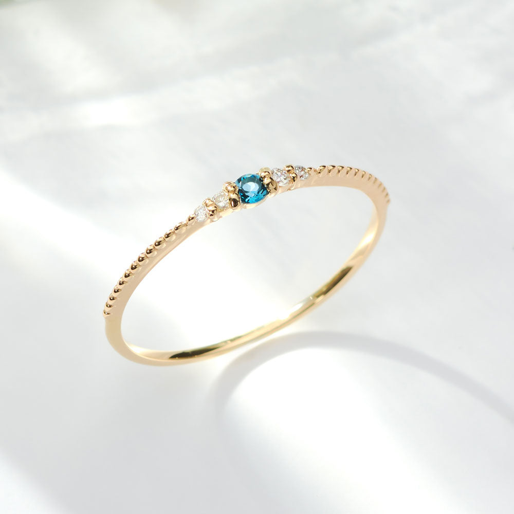 リングには輝くロンドンブルートパーズがあしらわれており、繊細な色合いが指先を彩ります。