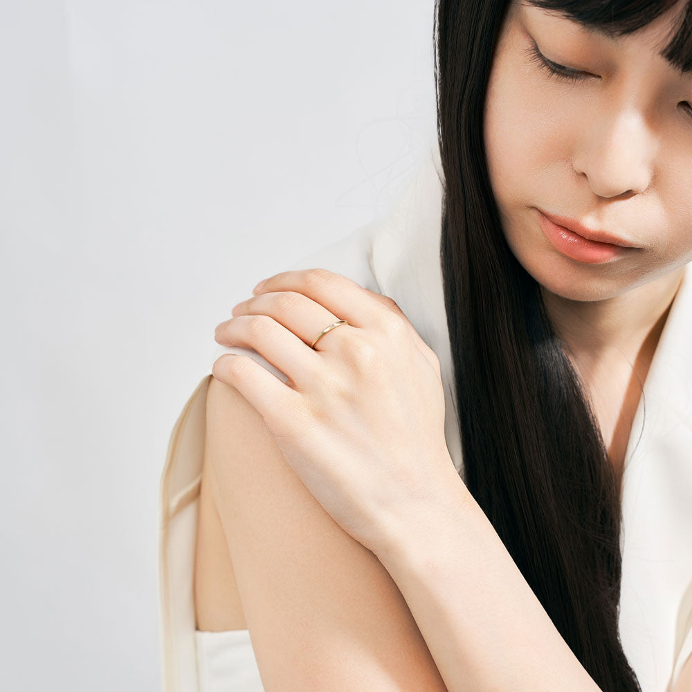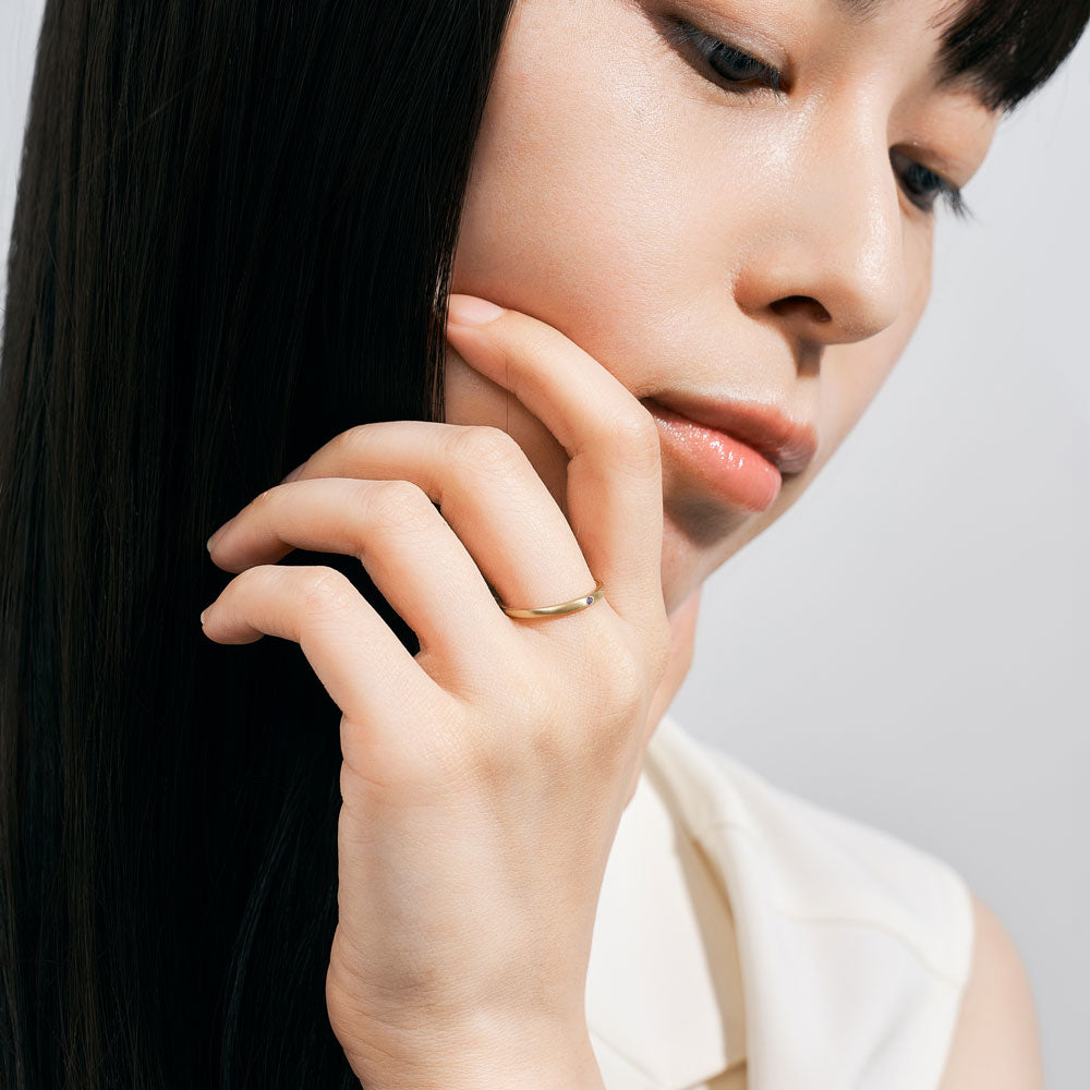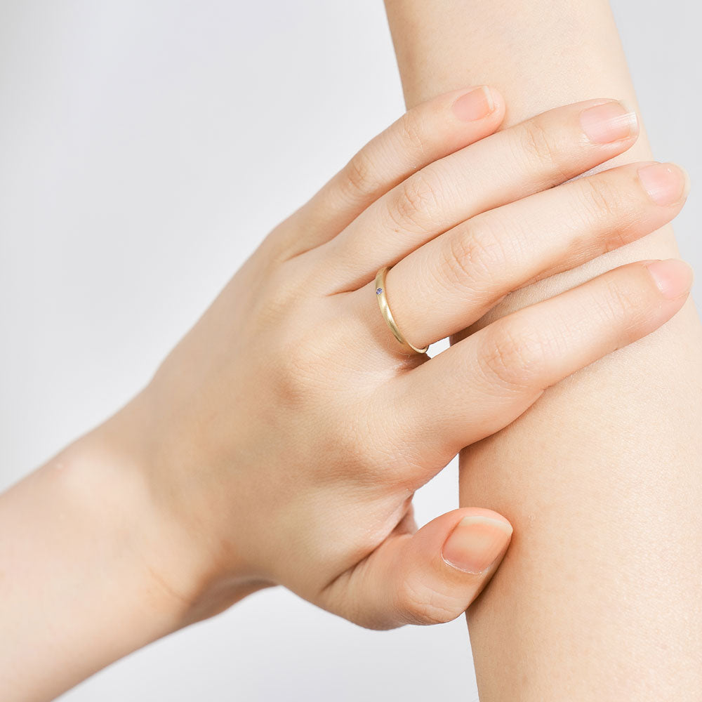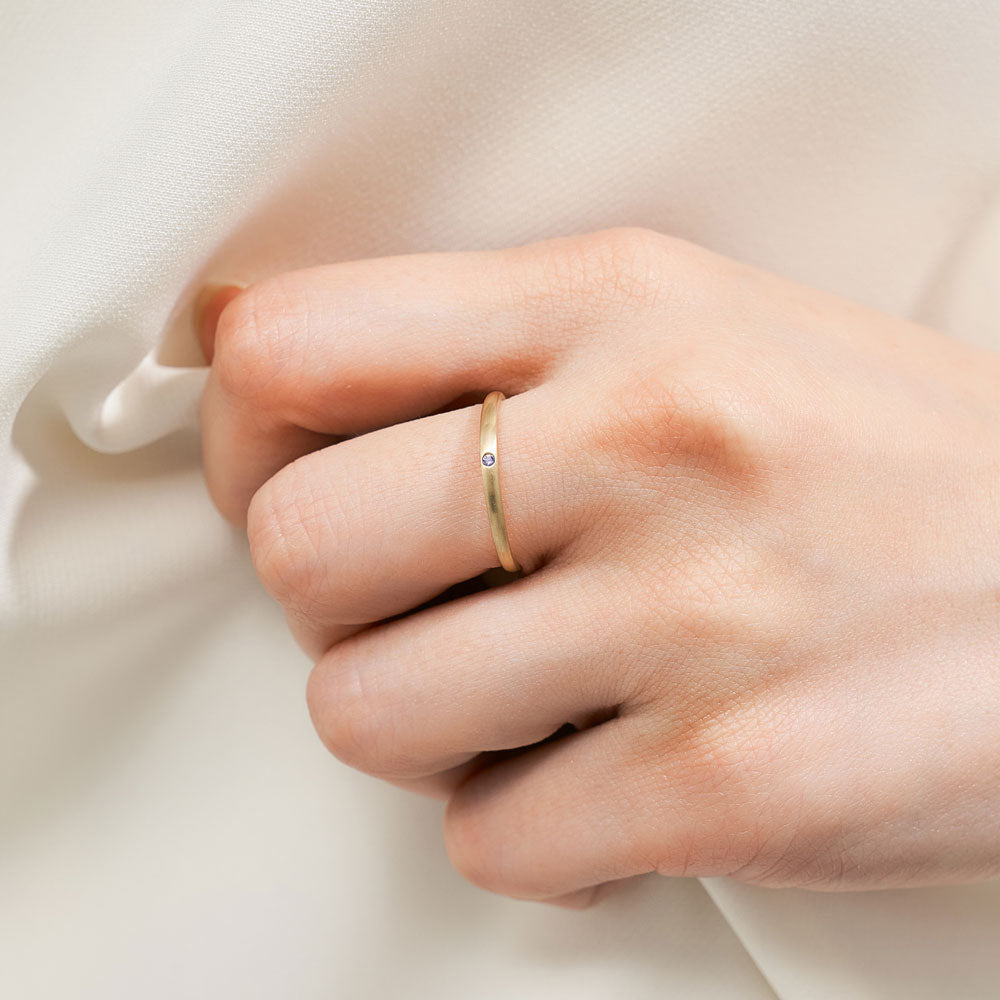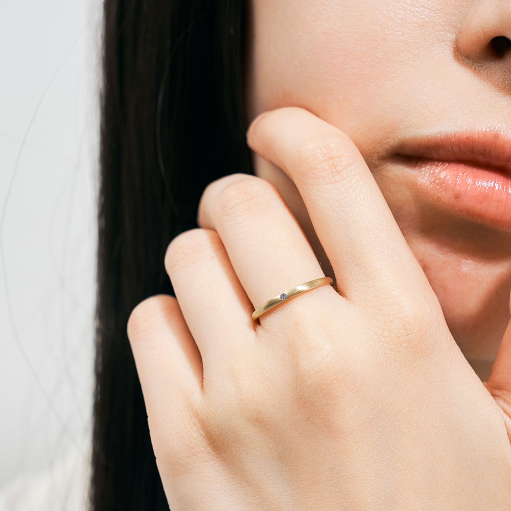 リングの表面はマット(艶消し)に仕上げ、センターにバースストーンを埋め込んだ、誕生石リングの中では珍しいタイプのデザイン。