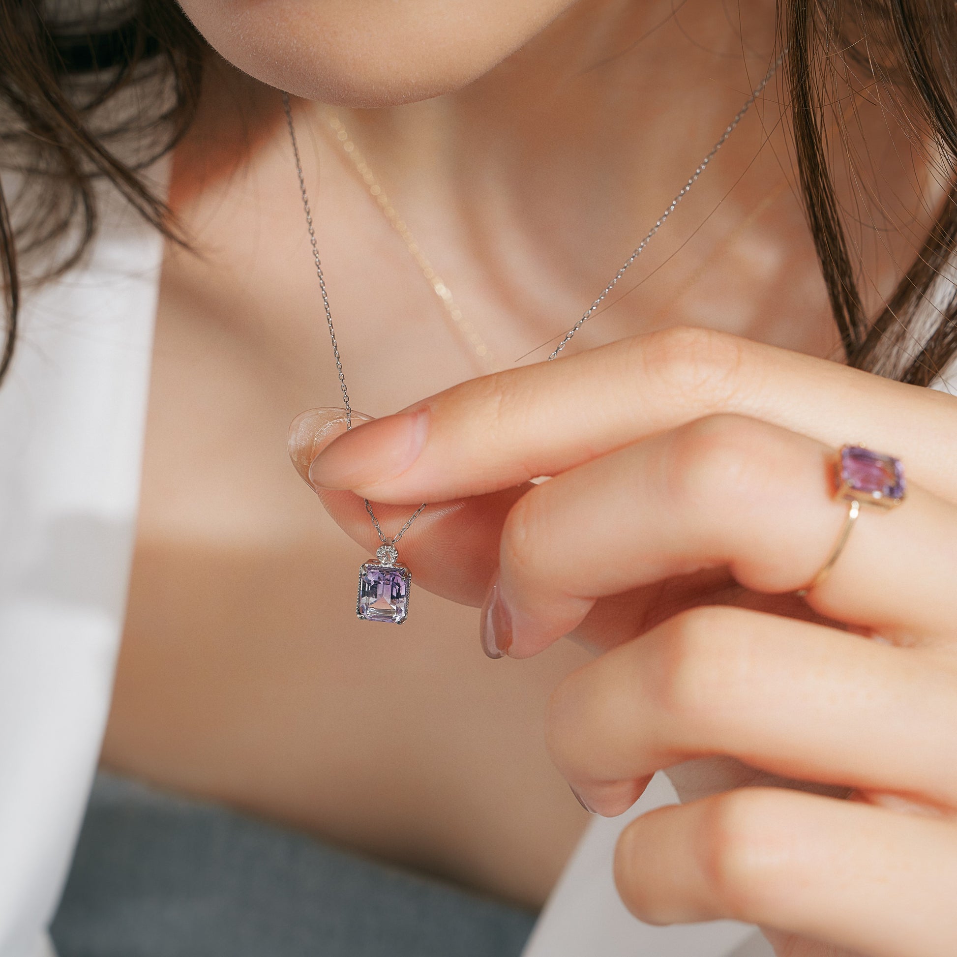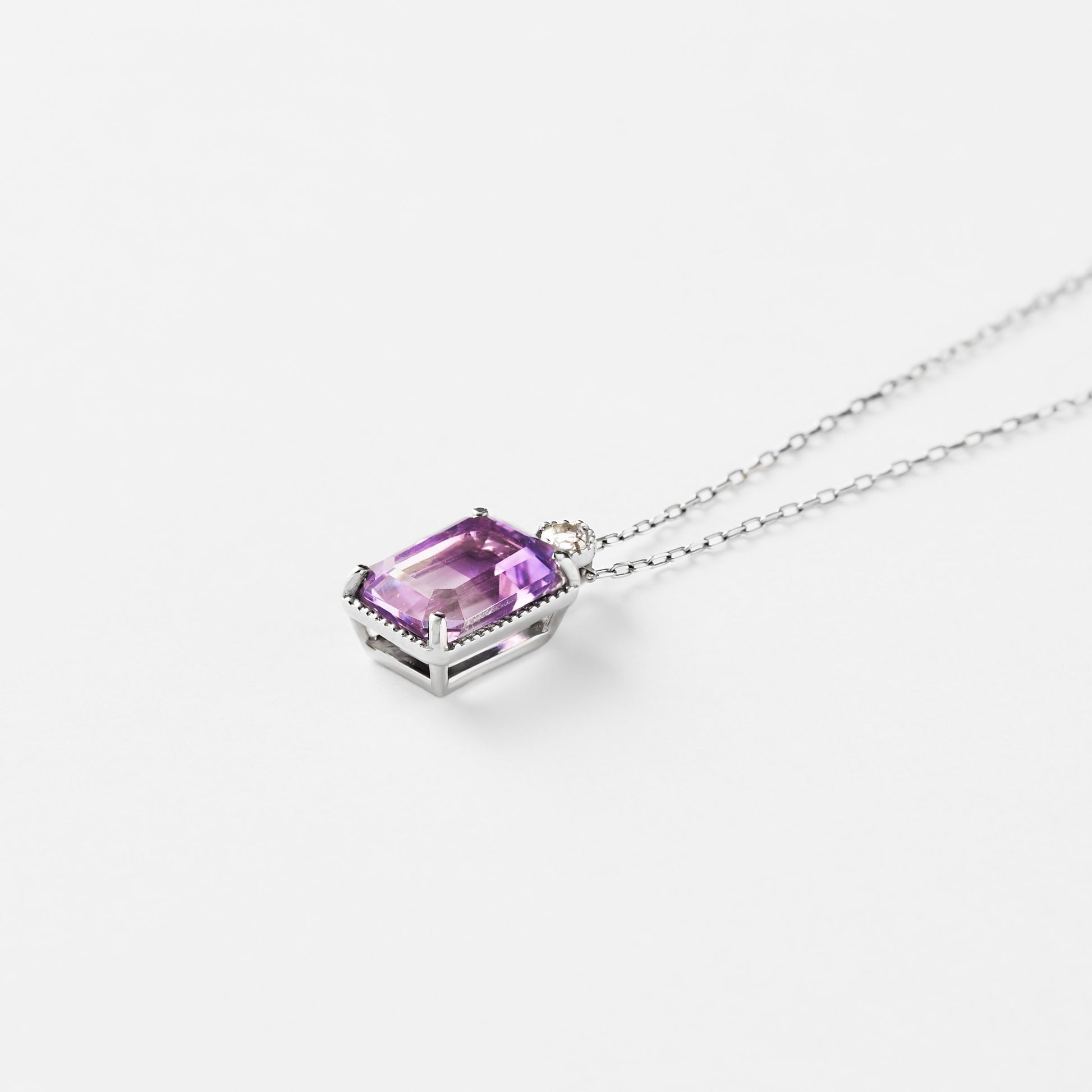 光を受けるたび、表情を変えるバイカラーアメジストに、そっと寄り添うホワイトトパーズを添えたネックレス。