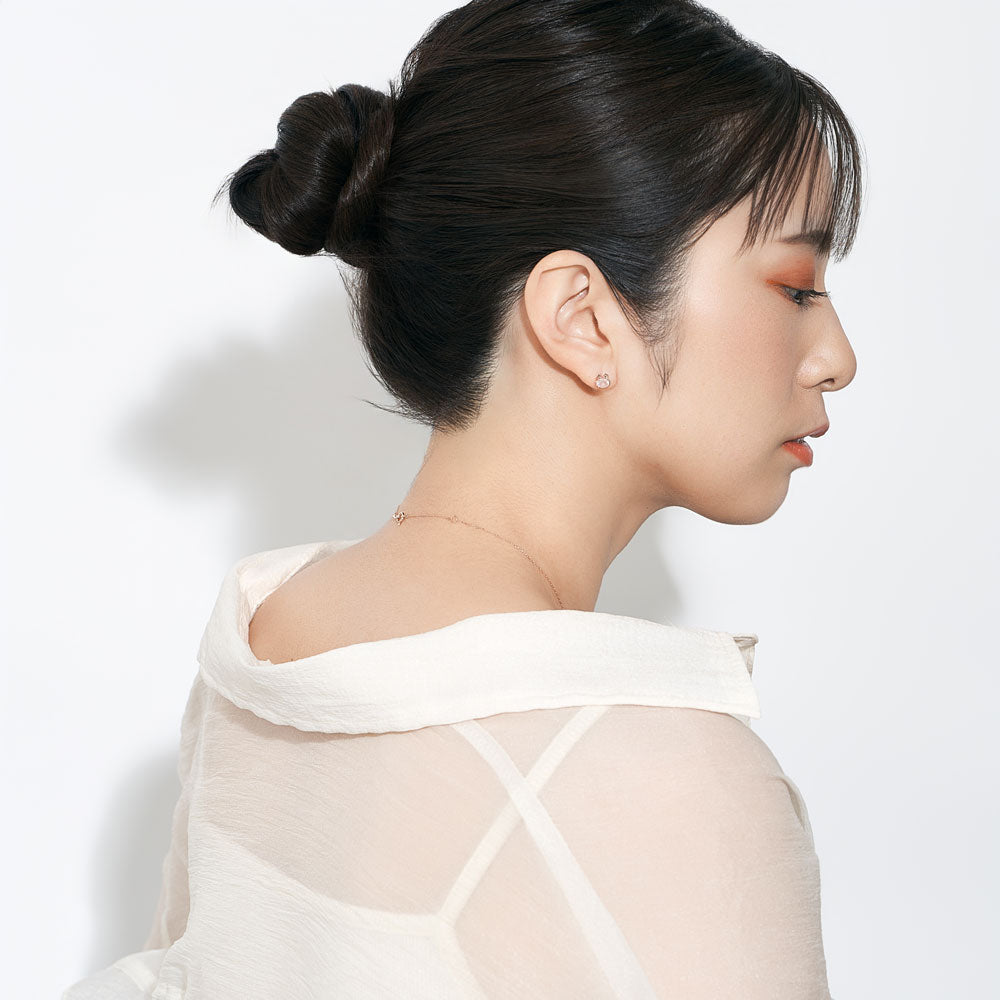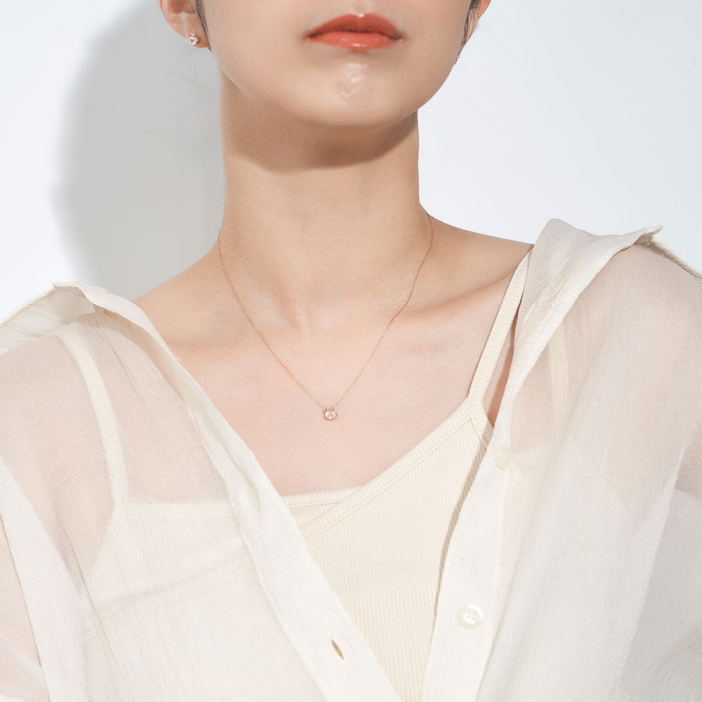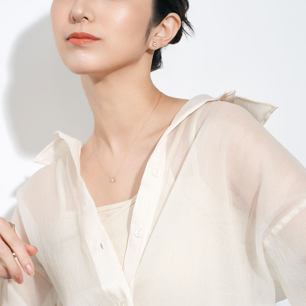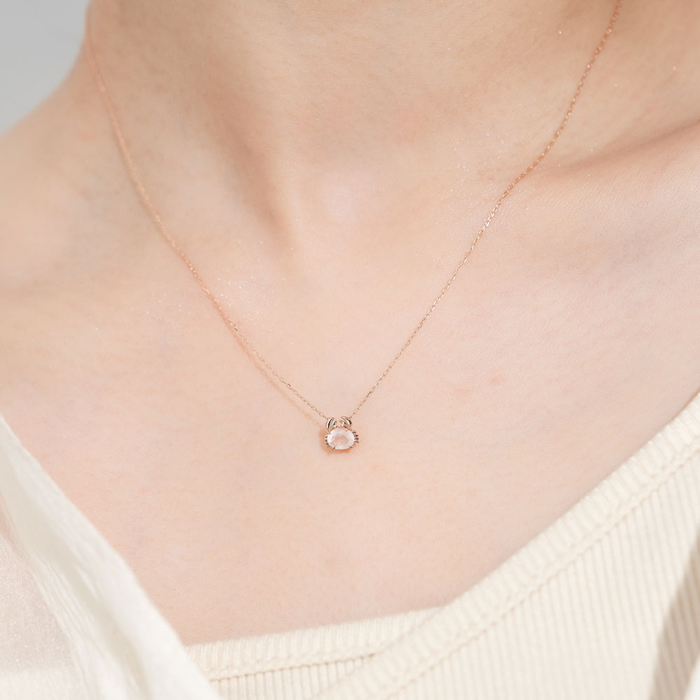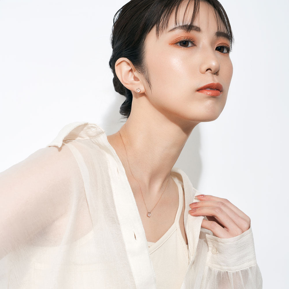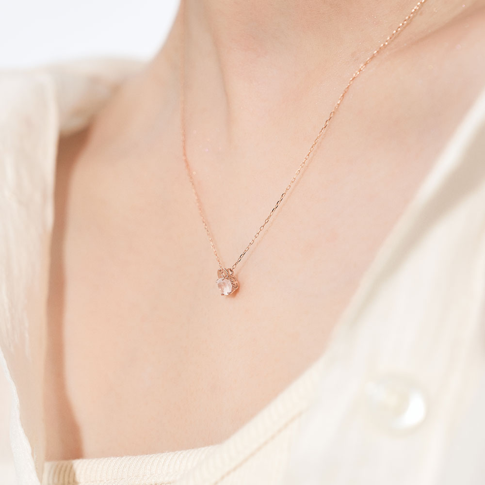 ピンクゴールドのあたたかい色合いが、淡いピンクのストーンをよりいっそうやさしく引き立て、穏やかで幸福感のあるカラーが、胸もとにほんのりとしたぬくもりを添えるジュエリーです。