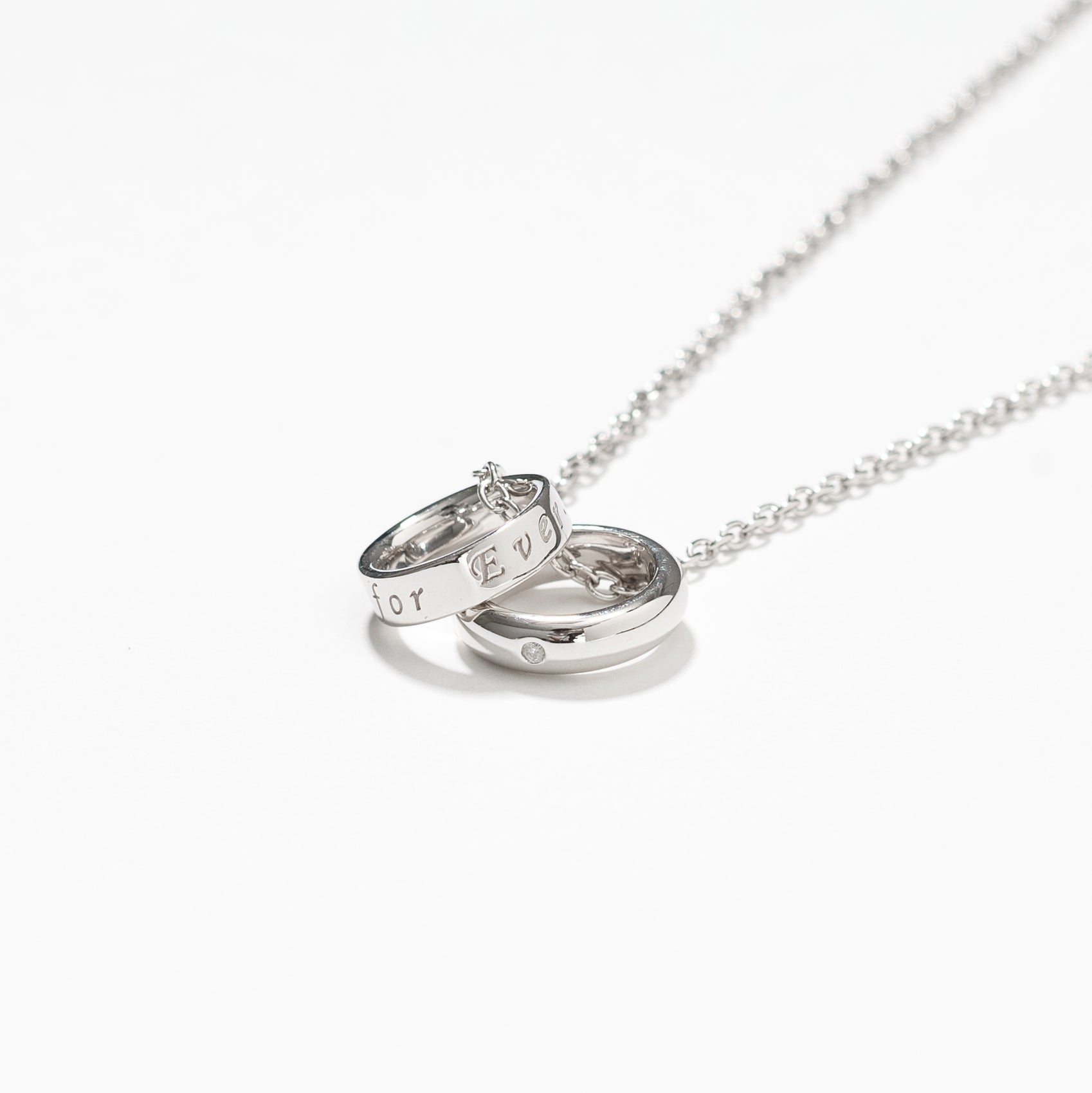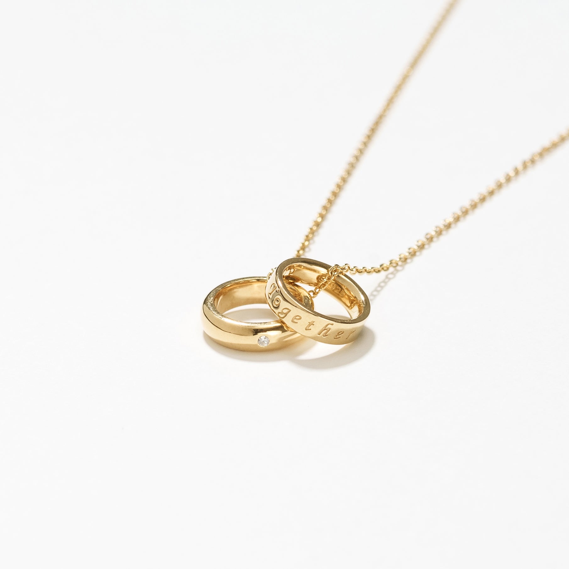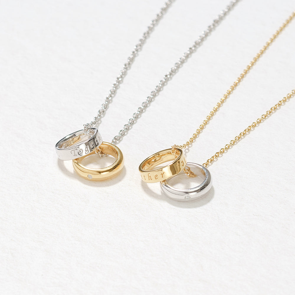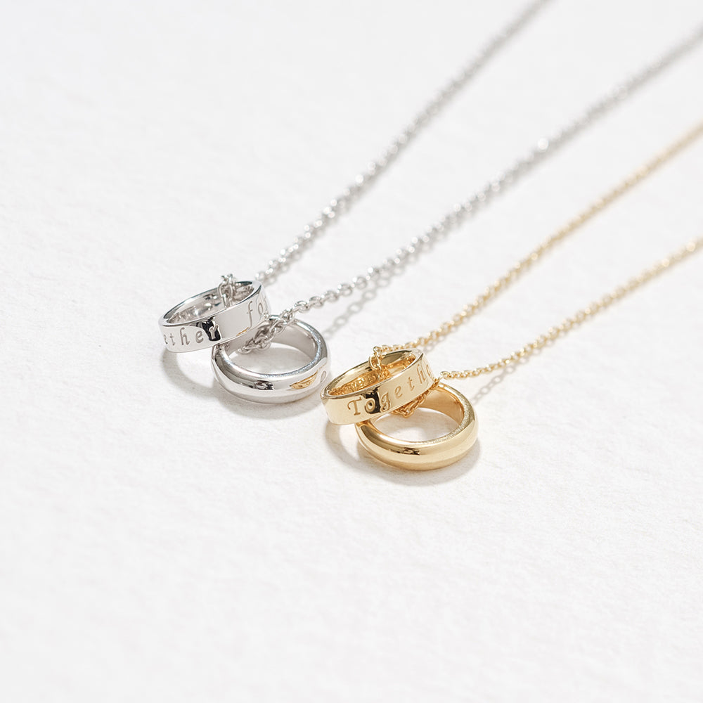 「Together for Ever (いつまでも一緒に)」のメッセージが彫り込まれたリングと、キュービックジルコニアを1石セッティングしたシンプルなリング、2つのリングを1つにした2連リングネックレスです。