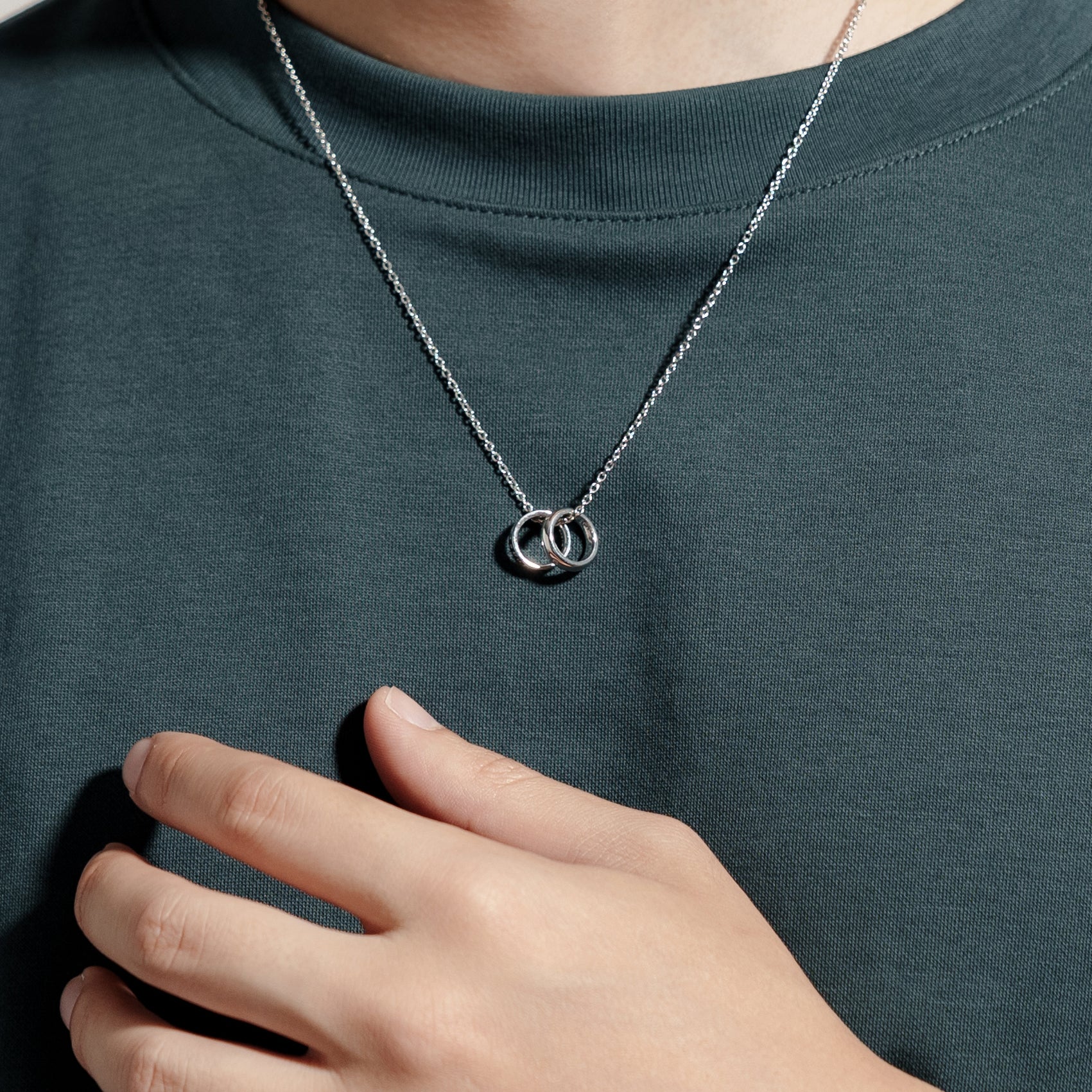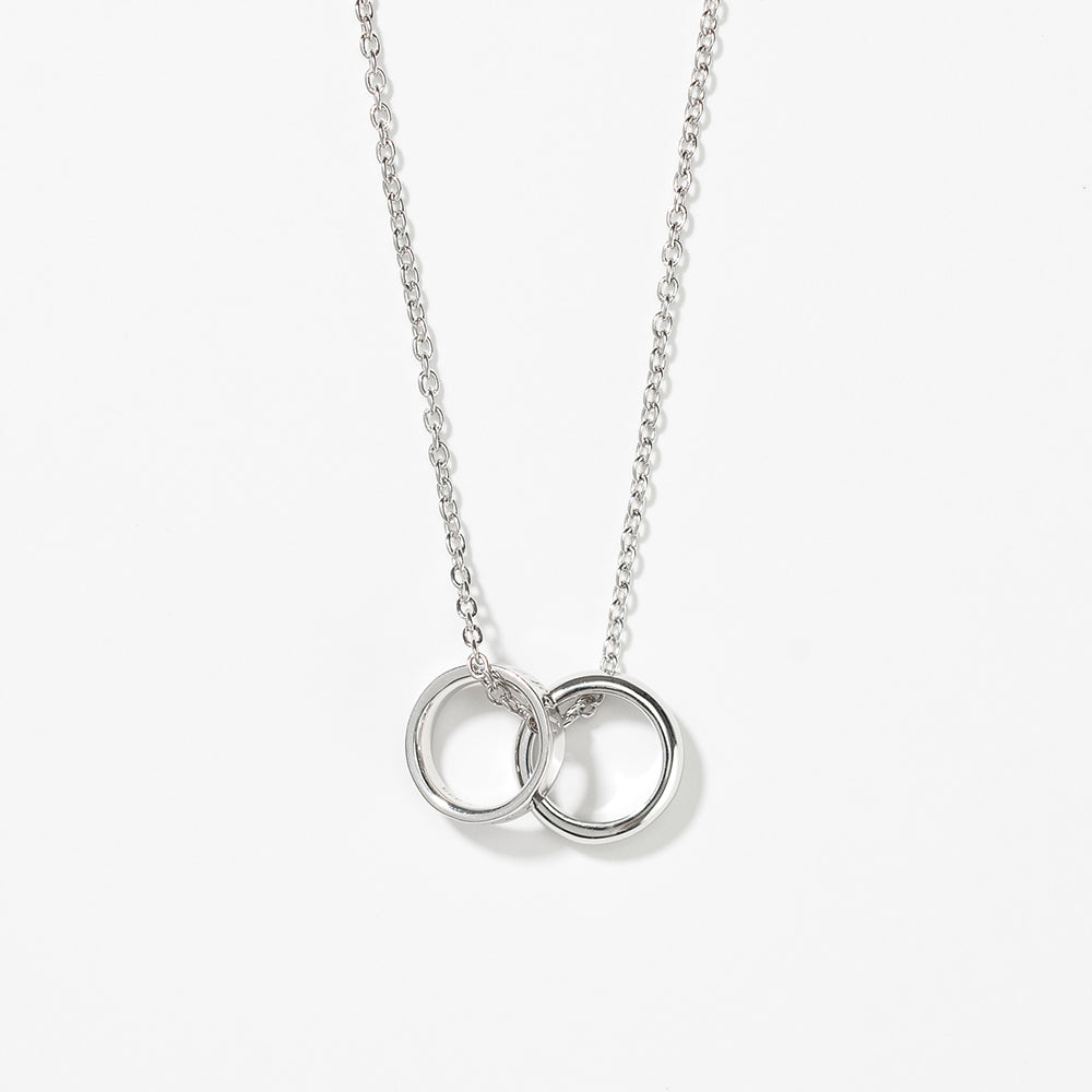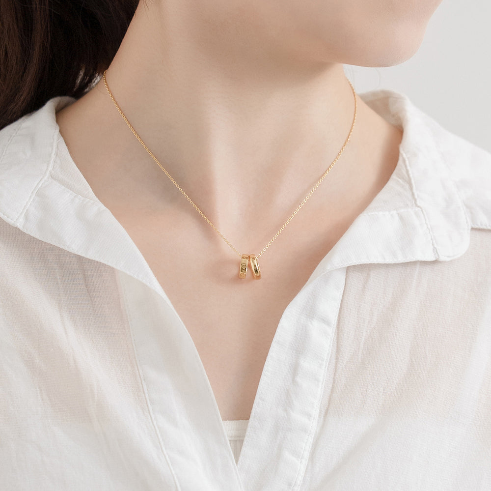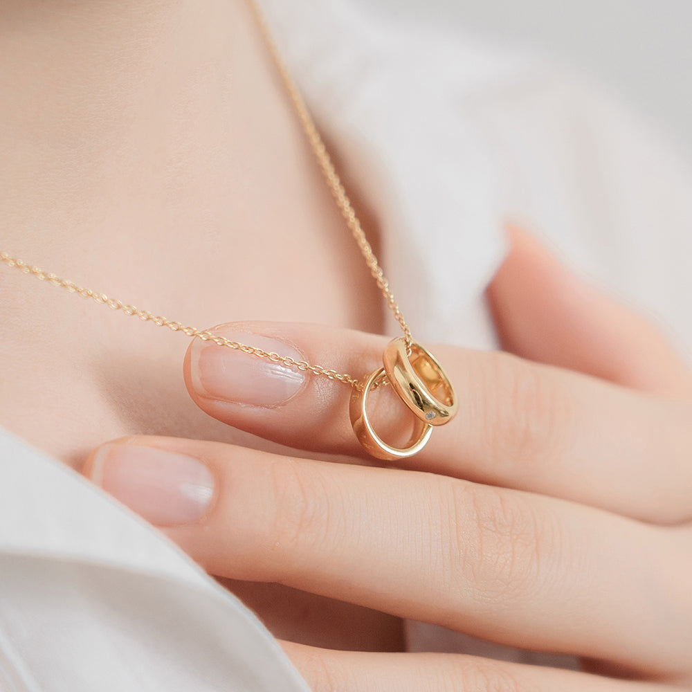 「Together for Ever (いつまでも一緒に)」のメッセージが彫り込まれたリングと、キュービックジルコニアを1石セッティングしたシンプルなリング、2つのリングを1つにした2連リングネックレスです。