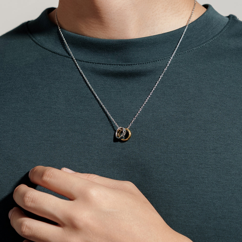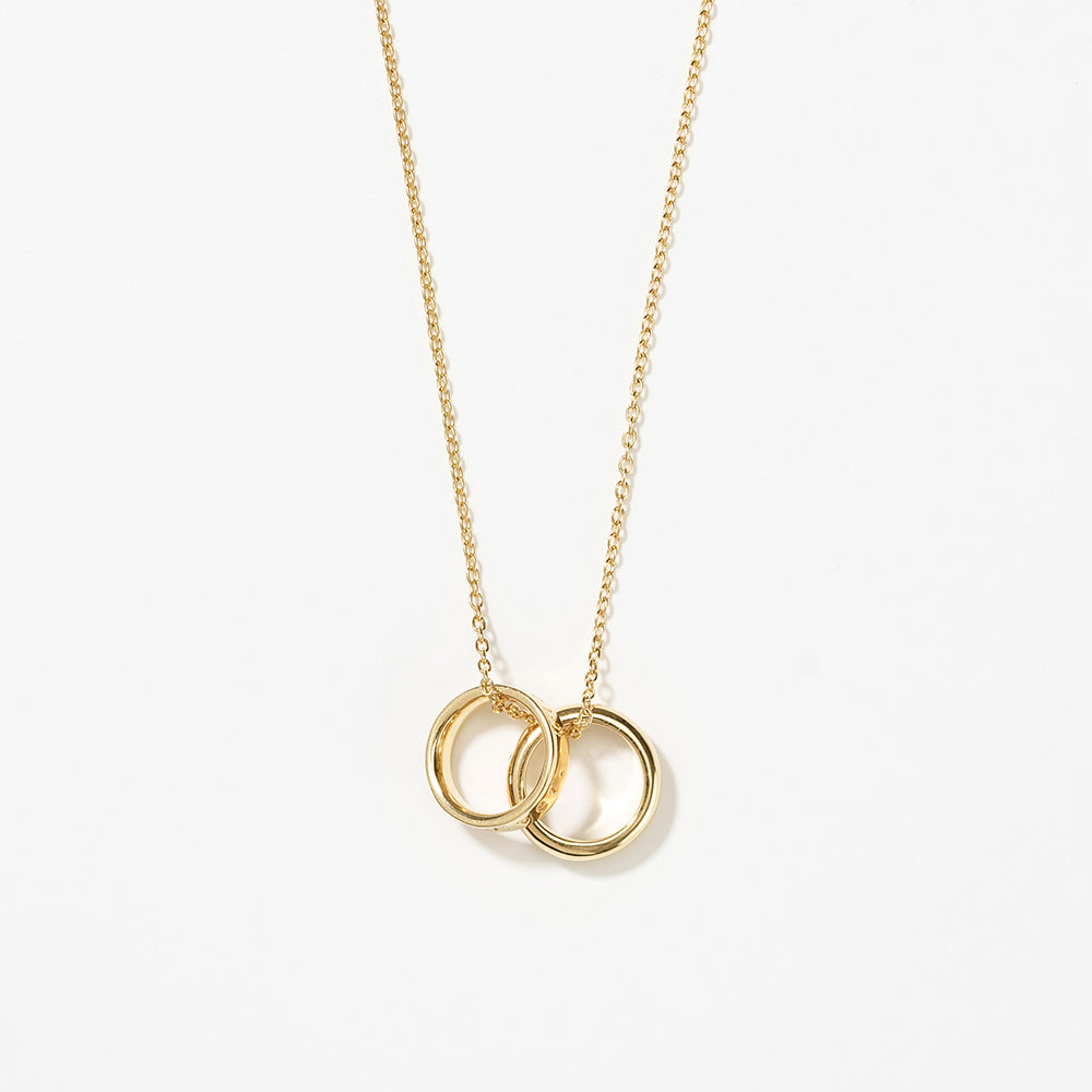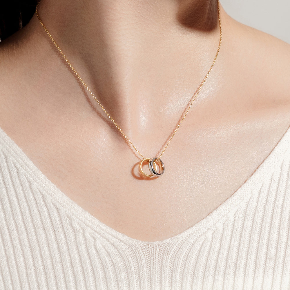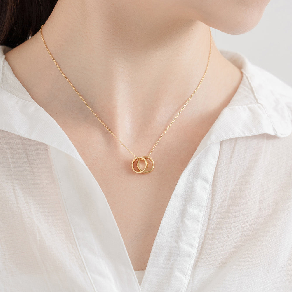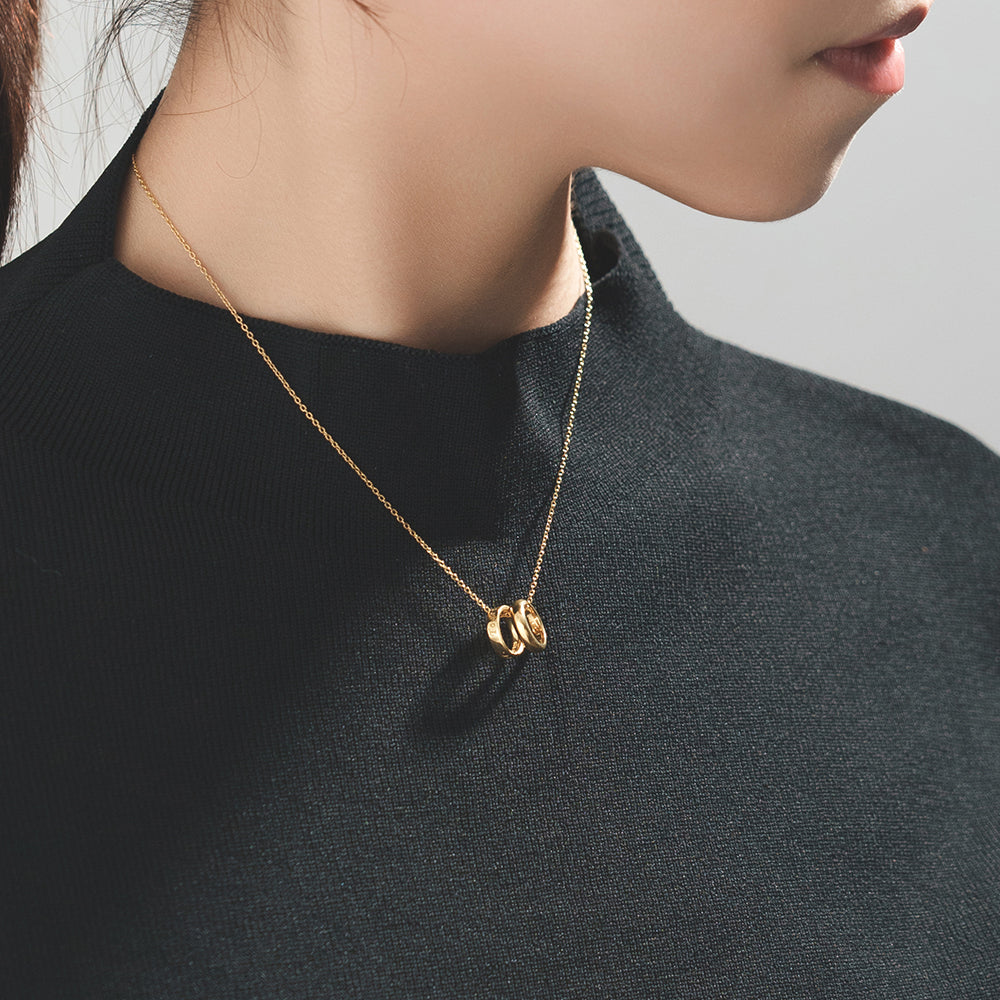 「Together for Ever (いつまでも一緒に)」のメッセージが彫り込まれたリングと、キュービックジルコニアを1石セッティングしたシンプルなリング、2つのリングを1つにした2連リングネックレスです。
