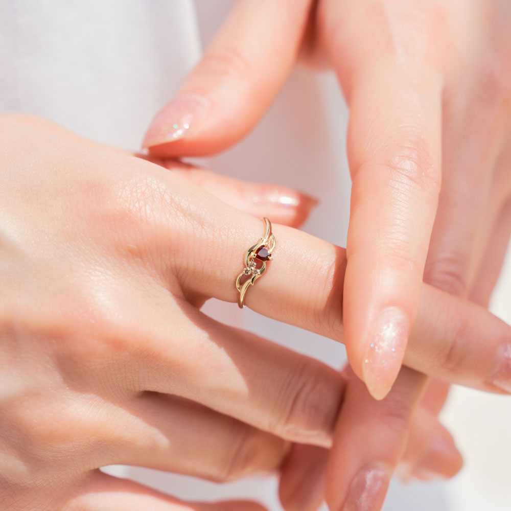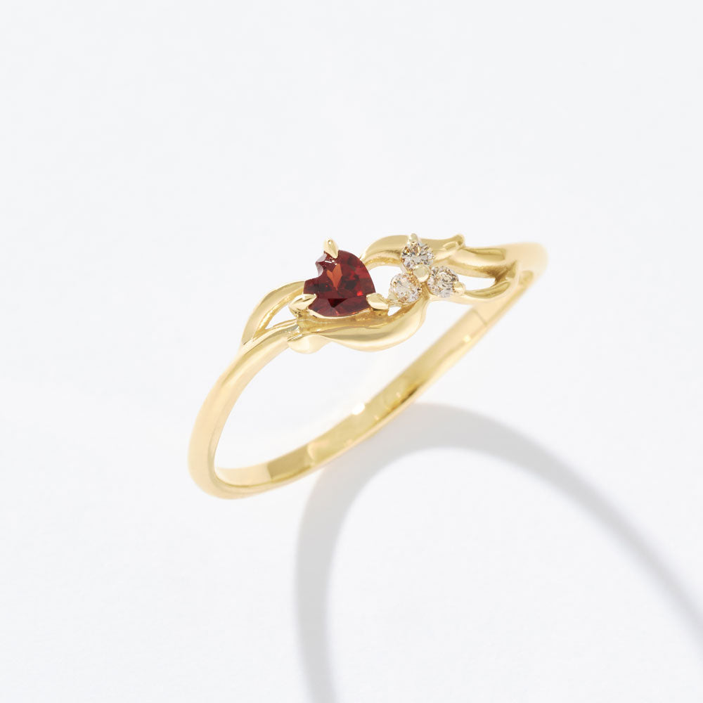 深みのある赤が印象的な、ハートカットのガーネットを主役にしたK10イエローゴールドリング。